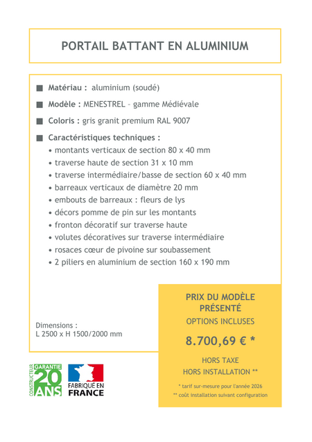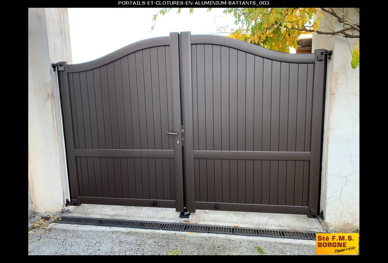 Le portail battant, proposé en aluminium, métal, PVC ou bois, allie esthétique et sécurité pour sublimer l'entrée de votre propriété. L'aluminium assure un style contemporain et résistant, le métal offre une robustesse durable, le PVC est économique et sans entretien, tandis que le bois apporte un charme authentique et naturel.