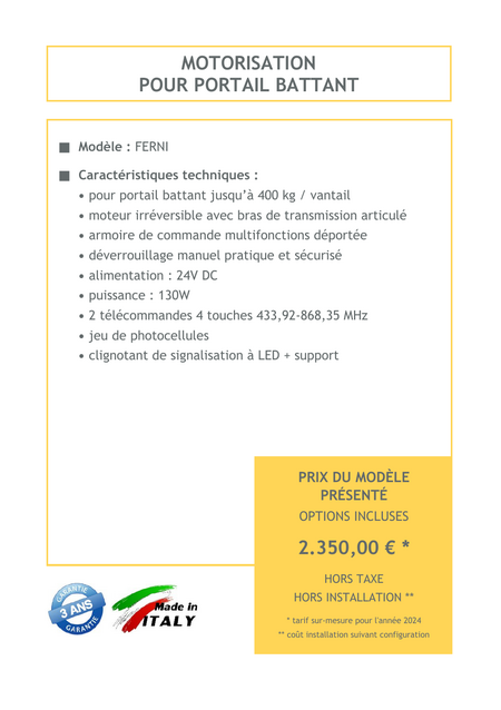 La motorisation de portail battant vous apporte un confort inégalé, vous permettant d'ouvrir et de fermer votre portail sans effort, directement depuis votre véhicule ou maison. Grâce à un système fiable et robuste, vous bénéficiez d'une sécurité accrue et d'un véritable gain de temps au quotidien. Transformez votre portail en un accès automatisé moderne et pratique, pour une expérience de vie plus agréable et sans contraintes.