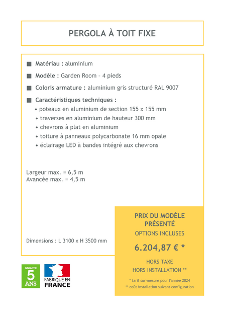 La pergola bioclimatique en aluminium allie élégance et innovation pour créer un espace extérieur adaptable en toute saison. Grâce à ses lames orientables, vous pouvez moduler l'ensoleillement et la ventilation selon vos envies, offrant confort et protection contre les intempéries. Transformez votre terrasse en un lieu de détente moderne et accueillant, tout en profitant d'une structure durable et sans entretien.